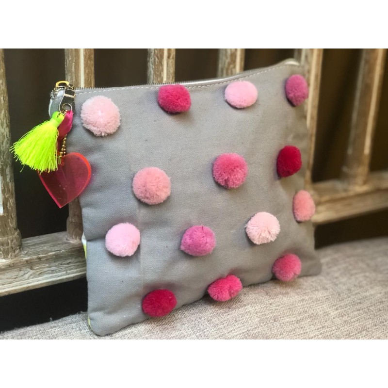 Original cosmetiquera, con doble vista, al frente, decorada con pompones de diferentes colores, y por la parte de atrás, tela a cuadros verde limón. Incluye tassel en el cierre.