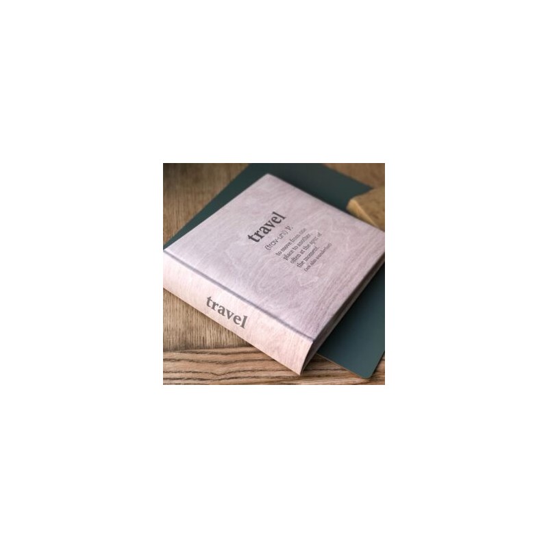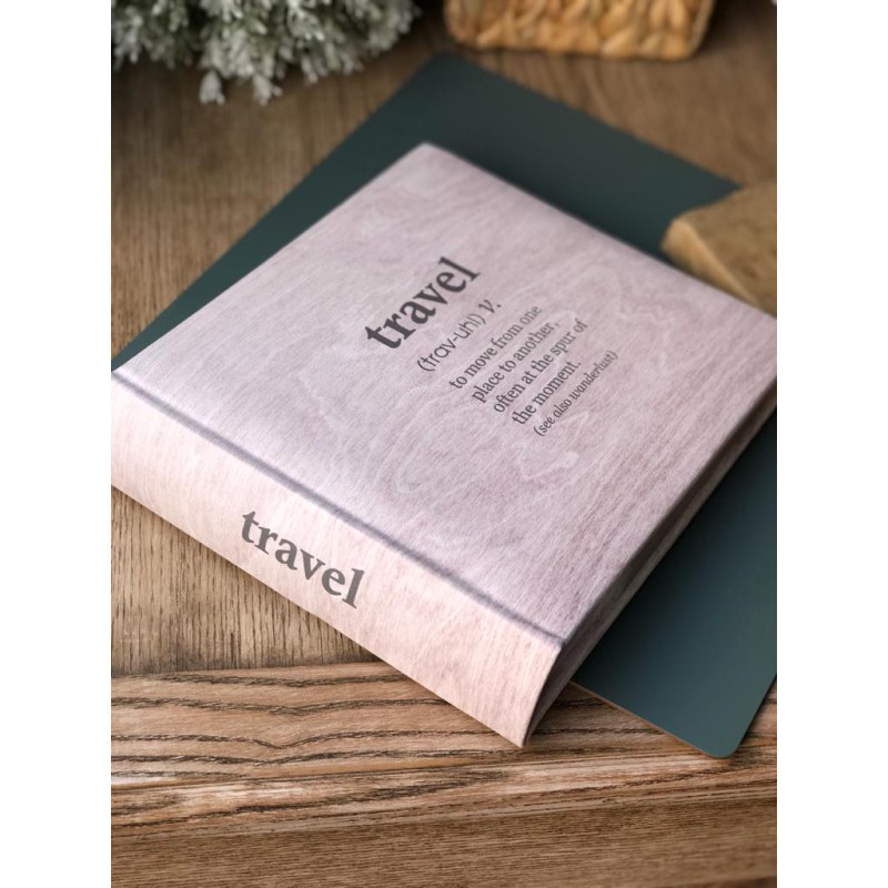 Album para fotos decorado con tela estampada y la leyenda: «Travel». El album tiene capacidad para 200 fotos de 6×4″. Interior plastificado para mayor practicidad y durabilidad de las fotos.